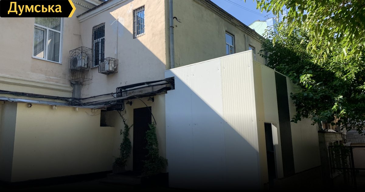 Дерибасовская, 1. На фото множество незаконных построек, но в данном случае речь об объекте в левом верхнем углу