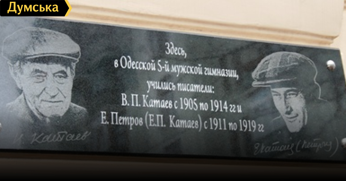 Мемориальную доску братьям Катаевым — Валентину и Евгению (он же Евгений Петров — соавтор Ильи Ильфа) открыли в Одессе. Ее установили на фасаде Одесского аграрного университета (ул.Пантелеймоновская, 13) – именно здесь располагалась 5-я мужская гимназия, в которой учились литераторы. Об этом сообщила пресс-служба горсовета. Инициатива создания мемориальной доски принадлежит ученикам школы-интерната №2. Более 50-ти учащихся разного возраста принимали участие в проекте, который носит название «С Катаевым и его героями». В ходе реализации проекта школьники вместе с родителями взяли опеку над палисадом семьи Катаевых на 2-ом христианском кладбище, получили в Одесском горисполкоме разрешение на установку мемориальной доски, собрали средства на ее изготовление. Руководитель проекта — учитель русского языка Одесской школы-интерната №2, лучший педагогический работник города 2012 года Нина Димова. Эскиз мемориальной доски изготовлен скульптором Татьяной Судьиной. 12 апреля мемориальная доска была открыта. СМЕРТЬ РОСІЙСЬКИМ ОКУПАНТАМ! Помітили помилку? Виділяйте слова з помилкою та натискайте control-enter |