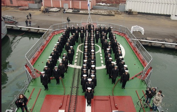 В рамках экскурсии собравшимся показали вооружение «Сагайдачного» и продемонстрировали строевое мастерство команды. В честь праздника моряки выстроились на вертолетной площадке флагмана в форме герба Украины и вместе с Алексеем Гончаренко передали привет полуострову.