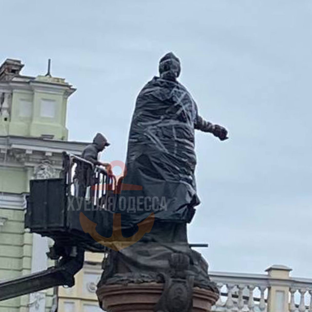 ОНОВЛЕНО О 14:27. Комунальники замотали скульптуру Катерині II у чорний пакет.