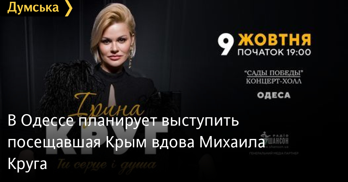 Российская певица, вдова Михаила Круга, «королева шансона» Ирина Круг (Ирина Глазко) планирует выступить в одесских «Садах победы» 9 октября.