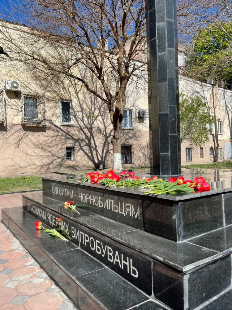 Участники ликвидации последствий аварии и представители власти возложили цветы к памятному знаку «Одесситам-чернобыльцам» на углу Малой Арнаутской улицы и Александровского проспекта.
