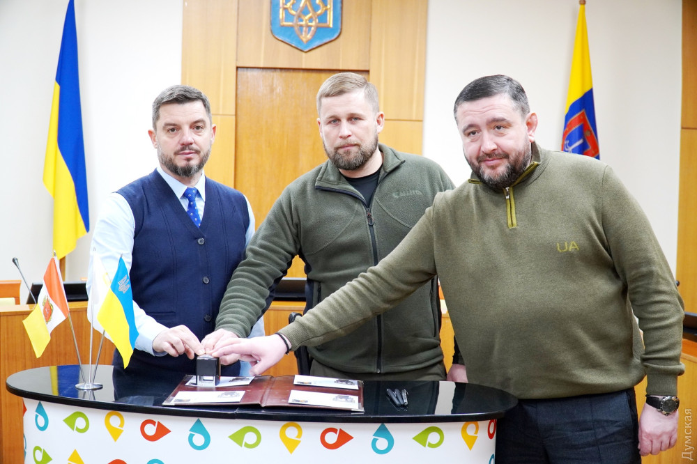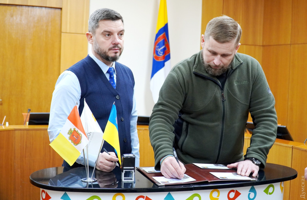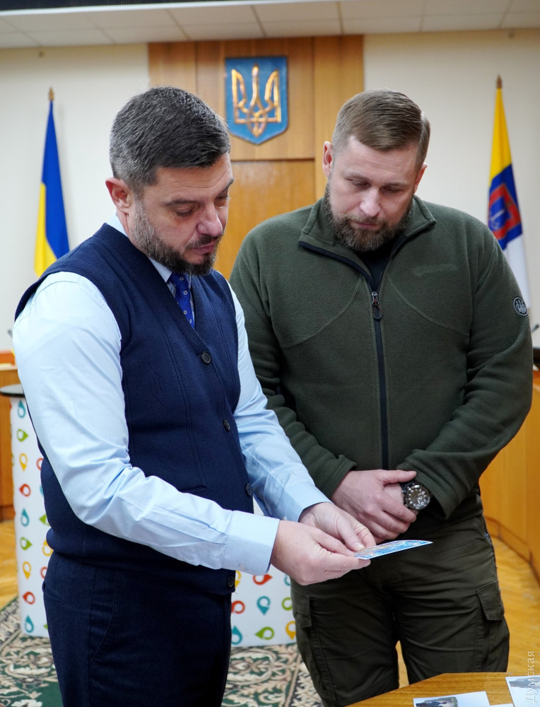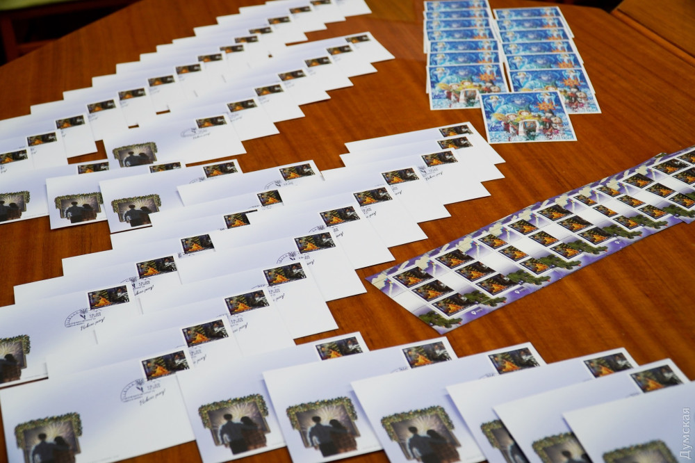 Директор одеського обласного управління «Укрпошти» Сергій Дрозд і голова обласної військової адміністрації Максим Марченко урочисто погасили нову поштову марку «Переможного нового року!» і презентували однойменні тематичні конверти.