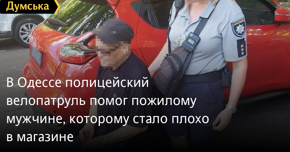 В Одесі поліцейський велопатруль допоміг чоловіку похилого віку, якому стало зле в магазиніПоліцейські під час патрулювання на велосипедах Приморського району Одеси прийшли на допомогу чоловікові похилого віку, якому стало погано в магазині. У патрульній поліції повідомили, що поліцейські звернули увагу на те, що у чоловіка бліде лице та порушена координація рухів. Інспектори надали йому першу допомогу та викликали швидку. Медики шпиталізували пенсіонера. Помітили помилку? Виділяйте слова з помилкою та натискайте control-enter Новини по цій темі: 29 липня 2025: В Усатово Одеської області сталася перестрілка: поліція працює на місці (відео, оновлено) 28 липня 2025: П'яний на "Ягуарі" або гіпертонік? Звільнений топ-посадовець одеської поліції хоче повернутися на службу 19 червня 2025: Дівчинку, яку шукали сотні одеситів, знайшли вбитою: поліція працює з чоловіком, ймовірно причетним до загибелі 27 травня 2025: Увели гектар в університету: на Одещині засудили земельних аферистів, але без посадки і Хвоста |