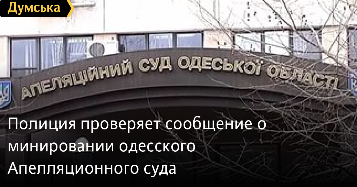 В 9:50 в полицию поступило телефонное сообщение о том, что административное здание Апелляционного суда заминировано. Как сообщили в пресс-службе ГУНП, на место происшествия немедленно выехала следственно-оперативная группа Малиновского отдела полиции, специалисты взрывотехнической службы и кинолог со служебной собакой. Сейчас принимаются меры по эвакуации из помещений посетителей и работников суда, а также установления личности правонарушителя. СМЕРТЬ РОСІЙСЬКИМ ОКУПАНТАМ! Помітили помилку? Виділяйте слова з помилкою та натискайте control-enter |