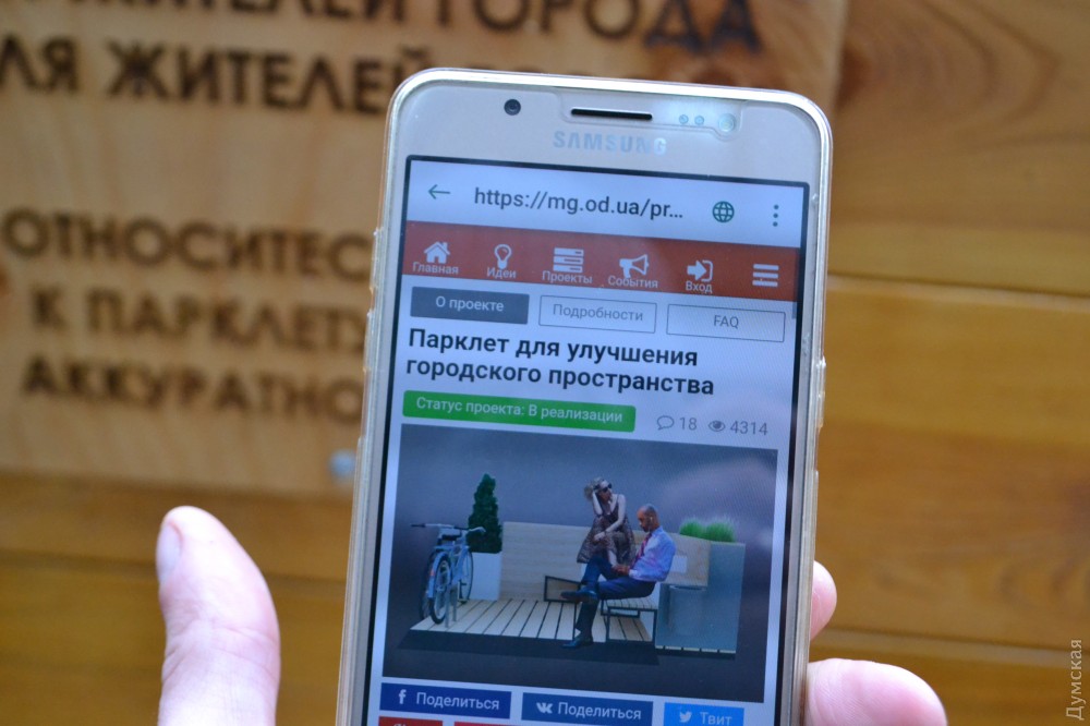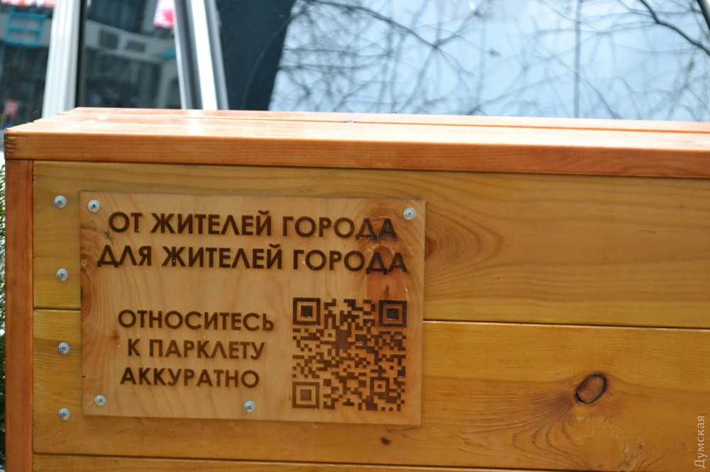 Как передает корреспондент «Думской», сооружение состоит из дизайнерской деревянной скамейки, настила и кадки с туей. Его построили и установили за счет добровольных пожертвований одесситов, которые собрали почти 13 тысяч гривен. Авторами одесского парклета являются архитекторы Екатерина Гагина и Мария Смирнова.
