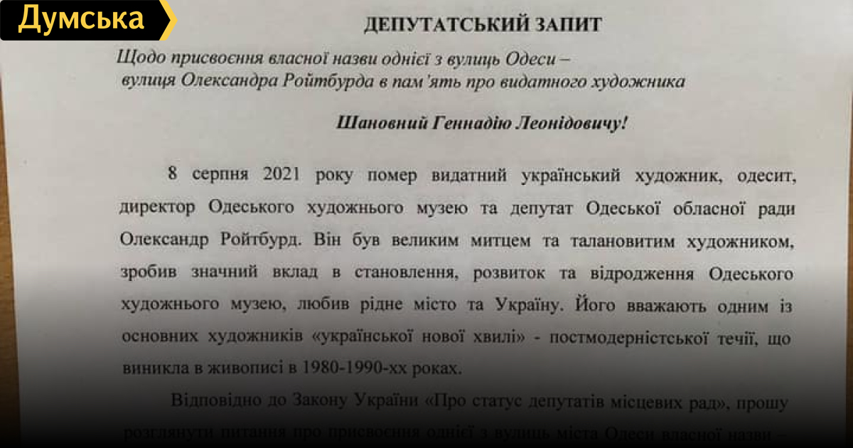 Чтобы увековечить память известного художника, директора Одесского художественного музея Александра Ройтбурда, который скончался 8 августа, глава фракции «Европейской солидарности» в Одесском облсовете Михаил Шмушкович предложил назвать его именем улицу.