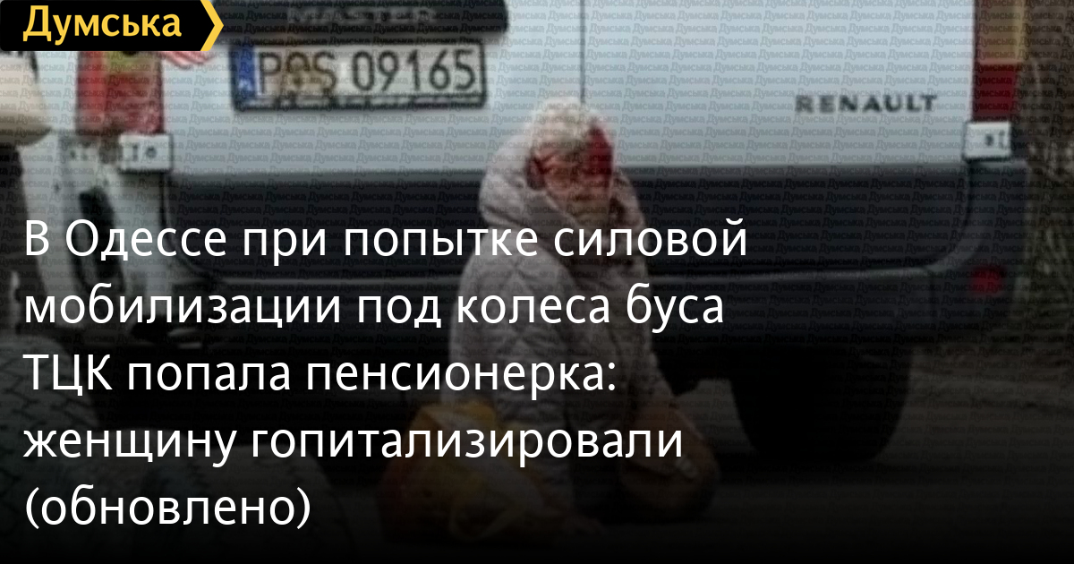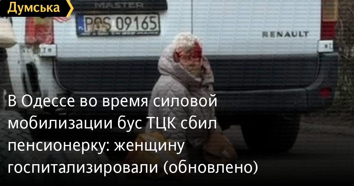 В Одессе при попытке силовой мобилизации под колеса буса ТЦК попала пенсионерка: женщину гопитализировали (обновлено)Сотрудники ТЦК сбили пожилую женщину, при попытке силовой мобилизации на улице Ивана и Юрия Лип. По словам очевидцев, водитель белого микроавтобуса сдавал назад и не заметил пенсионерку, проходившую рядом. Как утверждают свидетели, военнослужащие пытались мобилизовать мужчину, однако находившиеся поблизости женщины пытались ему помешать. Когда микроавтобус покидал место происшествия, он наехал на пожилую женщину. При этом мужчине удалось скрыться. Пострадавшая с окровавленным лицом оказалась под автомобилем, рассказали очевидцы. На место вызвали скорую помощь — медики пострадавшую госпитализировали. Патрульная полиция оформляет ДТП. «Думская» обратилась за комментарием в ТЦК, ответ на момент публикации не получен. ОБНОВЛЕНО В 11:09. По информации очевидцев у микроавтобуса, на котором передвигались представители ТЦК, разные номера. ОБНОВЛЕНО В 11:47. На данный момент выясняются все обстоятельства проишествия. По данному факту в территориальном центре комплектования начата служебная проверка, сообщили в Одесском областном ТЦК и СП. СМЕРТЬ РОССИЙСКИМ ОККУПАНТАМ! Заметили ошибку? Выделяйте слова с ошибкой и нажимайте control-enter |