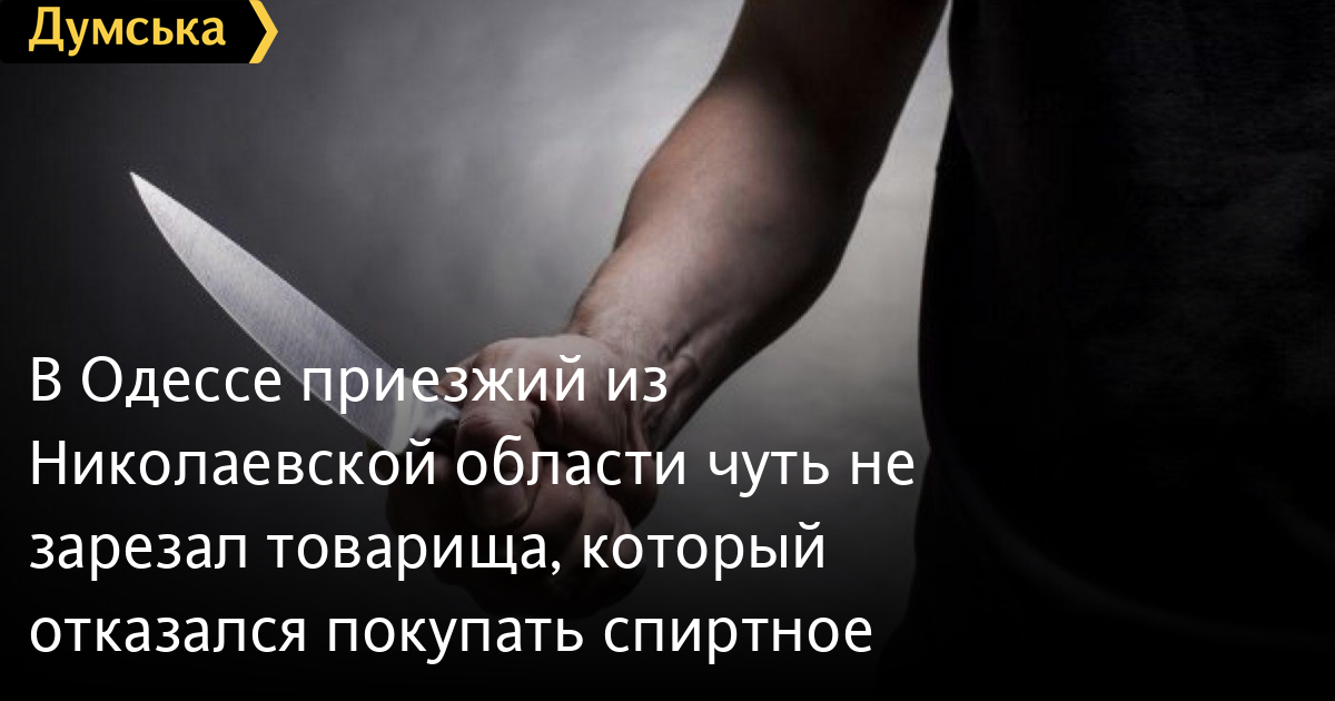 В Одессе приезжий из Николаевской области чуть не зарезал товарища, который отказался покупать спиртноеВ Одессе заключили в СИЗО 21-летнего уроженца Николаевской области, которого подозревают в нанесении ножевого ранения собутыльнику. Как сообщили в полиции, парень ударил ножом в живот 27-летнего земляка, когда тот во время пьянки отказался идти и покупать еще алкоголя. Инцидент произошел ночью на Академика Королева. Пострадавшему вызвали скорую помощь прохожие. За нанесение тяжкого телесного повреждения фигуранту грозит от 5 до 8 лет тюрьмы. СМЕРТЬ РОССИЙСКИМ ОККУПАНТАМ! Заметили ошибку? Выделяйте слова с ошибкой и нажимайте control-enter Новости по этой теме: 4 августа 2025: Экспертизу не сделали, камеры не отсмотрели: одесские волонтеры жалуются на саботаж полиции в расследовании убийства собаки 29 июля 2025: В Усатово Одесской области произошла перестрелка: полиция работает на месте (видео, обновлено) 28 июля 2025: Пьяный на «Ягуаре» или гипертоник? Уволенный топ-чиновник одесской полиции хочет вернуться на службу 19 июня 2025: Девочку, которую искали сотни одесситов, нашли убитой: полиция работает с мужчиной, вероятно, причастным к гибели |