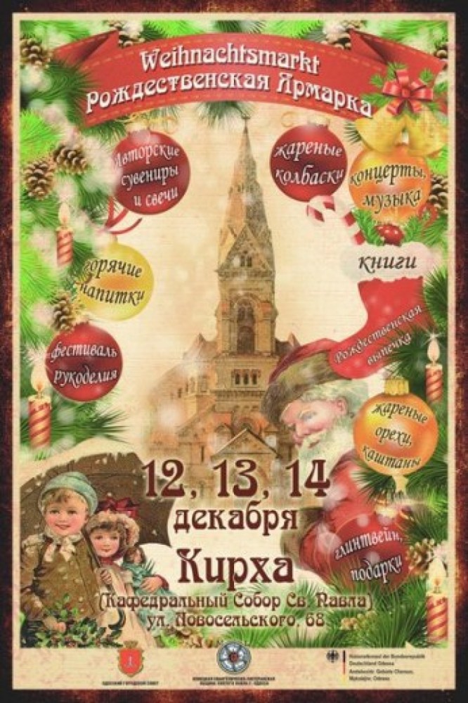С 12 по 14 декабря 2014 года в Одессе пройдет благотворительная Рождественская ярмарка. Торжественное открытие ярмарки состоится 12 декабря в 14:00 в соборе Св. Павла (Кирха).