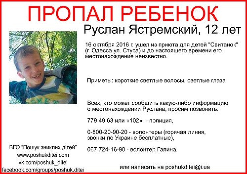 Одесская полиция разыскивает 12-летнего Руслана Ястремского, который 16 октября ушел из приюта для детей «Свитанок» и до сих пор его местонахождение неизвестно. Приметы ребенка — короткие светлые волосы, светлые глаза. Всех, кому что-либо известно о местонахождении мальчика, просят позвонить по телефонам: 779-49-63 или 102. СМЕРТЬ РОССИЙСКИМ ОККУПАНТАМ! Заметили ошибку? Выделяйте слова с ошибкой и нажимайте control-enter |