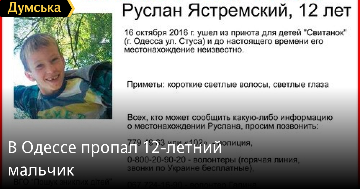 Одесская полиция разыскивает 12-летнего Руслана Ястремского, который 16 октября ушел из приюта для детей «Свитанок» и до сих пор его местонахождение неизвестно. Приметы ребенка — короткие светлые волосы, светлые глаза. Всех, кому что-либо известно о местонахождении мальчика, просят позвонить по телефонам: 779-49-63 или 102. СМЕРТЬ РОССИЙСКИМ ОККУПАНТАМ! Заметили ошибку? Выделяйте слова с ошибкой и нажимайте control-enter |
