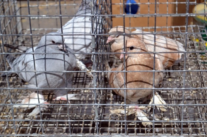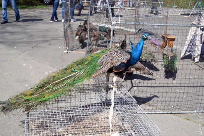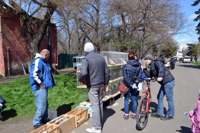 В погожий апрельский денек в парк слетелись голуби различных пород. Так, за голубей-дутышей просили 1000 гривен, иранских можно купить за 100, якобинца — за 600, а кучерявую как барашек птичку — за 500. Продавали на ярмарке и павлина — его можно было приобрести за 3500 гривен.