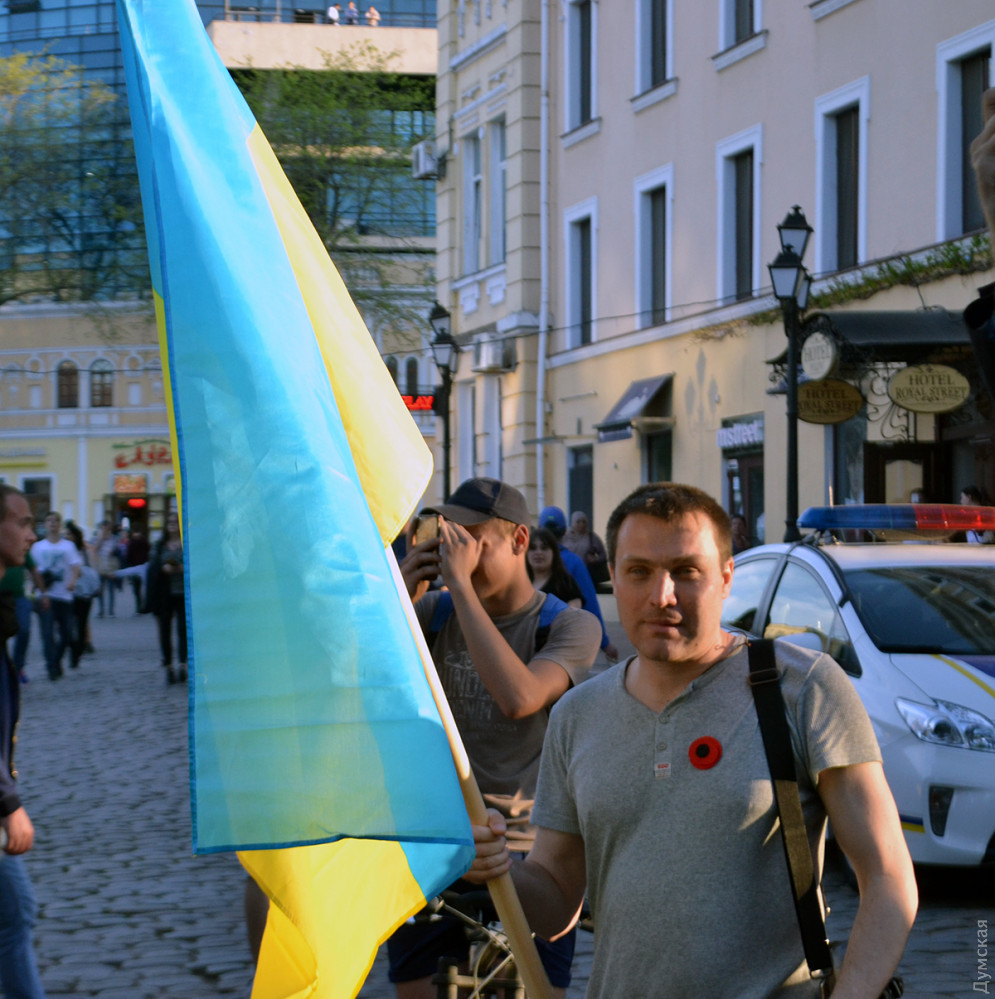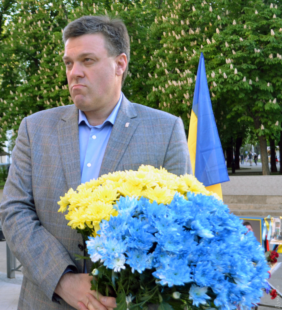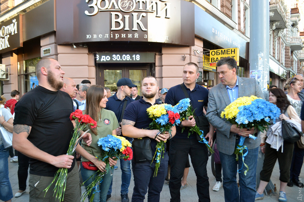На углу Дерибасовской и Преображенской, возле импровизированного мемориала погибшим 2 мая патриотам Игорю Иванову и Андрею Бирюкову, колонну встретил лидер «Свободы» Олег Тягнибок.