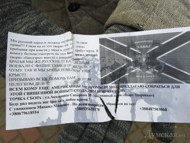 В Одессе распространяют необычные листовки. Некий Михаил Мищенко предлагает противникам «киевской хунты» — тем, кому «американцы еще не промыли мозги» — собраться для «священной войны» в массажном салоне на улице Академика Сахарова.