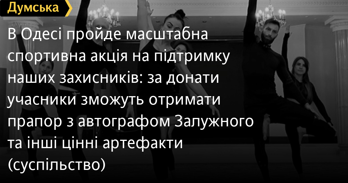 В Одесі пройде масштабна спортивна акція на підтримку наших захисників: за донати учасники зможуть отримати прапор з автографом Залужного та інші цінні артефакти (суспільство)17 грудня в готелі «Брістоль» на Пушкінській, 15 відбудеться масштабний спортивний благодійний проєкт «Народжені бути вільними», спрямований на збір коштів для українських військовослужбовців. Організатори заходу — спортивний клуб «Махарадж», фітнес-клуб Under Air та організація Ірини Заграничної — з 10 до 13:00 влаштують наймасовіше функціональне тренування країни з найкращими тренерами, а потім сеанс йоги. О 17:00 розпочнеться благодійний аукціон, мета якого зібрати два мільйони гривень на закупівлю обмундирування та обладнання для окремого підрозділу спецпризначенців Національної гвардії України «Омега». Учасники аукціону за донати зможуть отримати цінні артефакти і трофеї — прапор з автографом головнокомандувача Збройних сил України Валерія Залужного, футбольний м'яч з автографом Андрія Шевченка, журнал Time, присвячений Володимиру Зеленському, бойові трофеї зі звільнених українських територій. Також у них буде можливість написати послання окупантам на снарядах, які наші воїни незабаром випустять по ворожих позиціях. Ведучий вечора — столичний шоумен Володимир Такудіс, також перед гостями виступить співак SHUMEI. Більше дізнатися про захід, а також придбати запрошення можна на сайті vilni.od.ua. Помітили помилку? Виділяйте слова з помилкою та натискайте control-enter |
