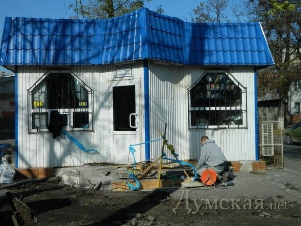 В Одессе разгорается скандал вокруг сине-желтой ограды, которой обнесли небольшой магазин «Топаз», что на улице Лазарева.