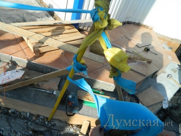 Как рассказали в пресс-службе облУВД, на место инцидента отправились оперативники. Они установили, что куски ткани, из которых соорудили ограждение, действительно синего и желтого цветов. Нашли милиционеры и умельца, установившего ограду. Им оказался рабочий, который перекладывает плитку вокруг торговой точки.