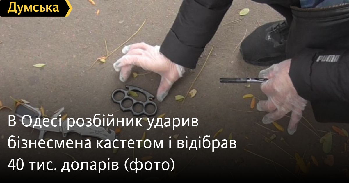 В Одесі розбійник ударив бізнесмена кастетом і відібрав 40 тис. доларівРозбійний напад було скоєно вчора вдень на Прохоровській вулиці в Одесі. Як повідомили «Думській» у поліції, потерпілий — чоловік 1995 року народження, підприємець. Злочинець підбіг до нього і вдарив кастетом по голові, після чого забрав рюкзак, у якому було 40 тисяч доларів США. Потім він спробував втекти, але був схоплений співробітниками СБУ і поліції. Зловмисником виявився житель області 1992 року народження. Слідство вважає, що він знав про наявність значної суми у потерпілого і заздалегідь готувався до злочину. У нього вилучили ніж, кастет і викрадені гроші. Щодо підприємця, то його госпіталізували із закритою черепно-мозковою травмою та струсом головного мозку. СМЕРТЬ РОСІЙСЬКИМ ОКУПАНТАМ! Помітили помилку? Виділяйте слова з помилкою та натискайте control-enter Новини по цій темі: 29 липня 2025: В Усатово Одеської області сталася перестрілка: поліція працює на місці (відео, оновлено) 28 липня 2025: П'яний на "Ягуарі" або гіпертонік? Звільнений топ-посадовець одеської поліції хоче повернутися на службу 19 червня 2025: Дівчинку, яку шукали сотні одеситів, знайшли вбитою: поліція працює з чоловіком, ймовірно причетним до загибелі 27 травня 2025: Увели гектар в університету: на Одещині засудили земельних аферистів, але без посадки і Хвоста |