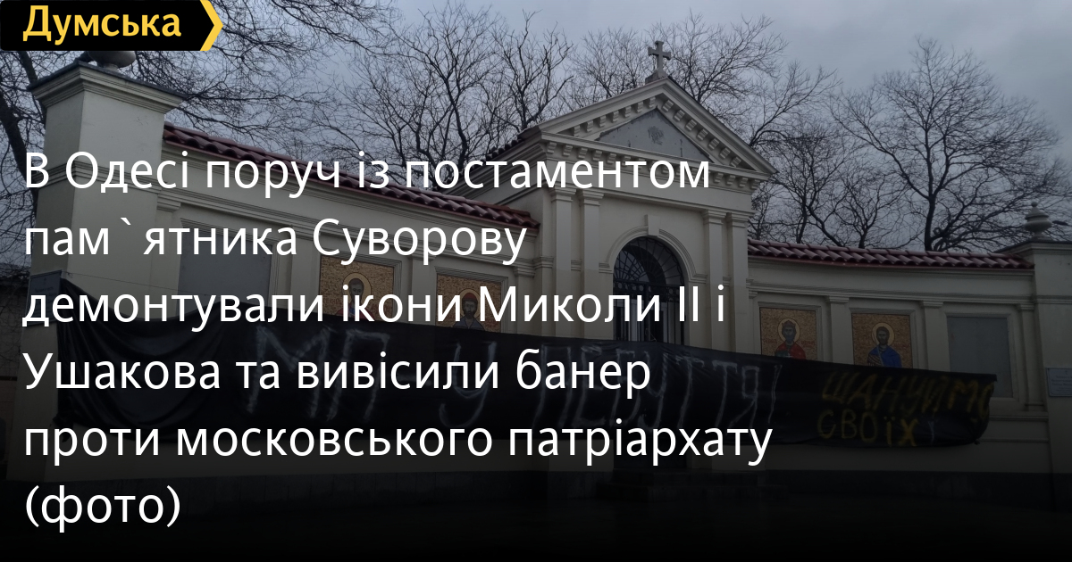В Одесі поруч із постаментом пам`ятника Суворову демонтували ікони Миколи II і Ушакова та вивісили банер проти московського патріархатуНевідомі активісти демонтували з фасаду одеської каплиці на честь Нерукотворного образу господа Ісуса Христа, що розташовується біля постаменту знесеного пам'ятника Олександрові Суворову, ікони канонізованих російською церквою імператора Миколи II і командувача Чорноморським флотом Федора Ушакова. На їхньому місці з'явився великий банер із написом «МП - у небуття! Шануймо своїх!». Фотографії опублікував громадський діяч Юрій Дяченко. На місці залишилися ікони Дмитра Донського, Олександра Невського, а також українським князям Володимиру Великому і Ярославу Мудрому, «це примазування «руського міра» до історії Київської Русі», — зазначає Дяченко. «Давайте чесно: цей іконостас і ця каплиця позаду пам'ятника Суворову не зі святими, а є продовженням нав'язуваної нам руськомирської традиції. І якщо вже демонтувати цей комплекс, встановлений на честь Суворова, російських воїнів і керівників, то це прибирати також треба», — вважає активіст. Помітили помилку? Виділяйте слова з помилкою та натискайте control-enter |