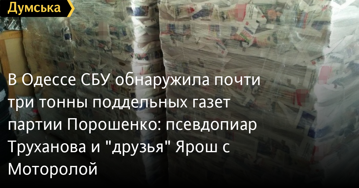 По данным «Думской», обнаруженная СБУ печатная продукция копирует газету Блока Петра Порошенко «Солидарность». На первой полосе изображены Порошенко, Гройсман, Парубий и Турчинов, расхваливающие мэра Одессы Геннадия Труханова. Также там есть коллаж, где городской голова помещен на постамент Дюка. Под ним стоят лидеры боевиков Захарченко, Плотницкий и покойные Гиви с Моторолой, а также украинские деятели Турчинов и Ярош. Выше надпись «Одесса дарит мир».