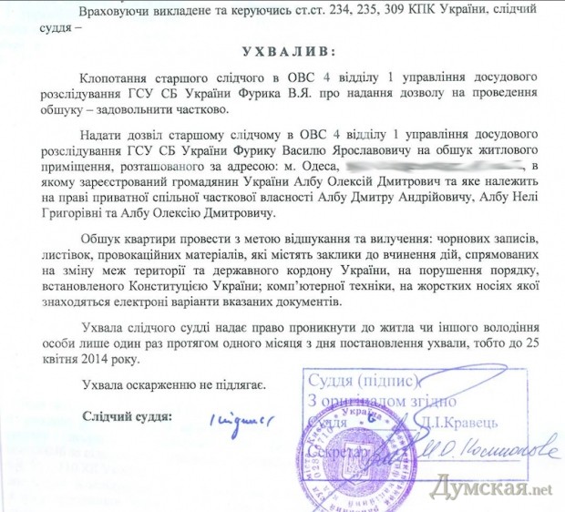 Также утром правоохранительные органы провели обыски на квартирах главы Союза православных граждан Украины Валерия Каурова, который скрывается от правосудия, и депутата облсовета, лидера одесской организации партии «Боротьба» Алексея Албу.