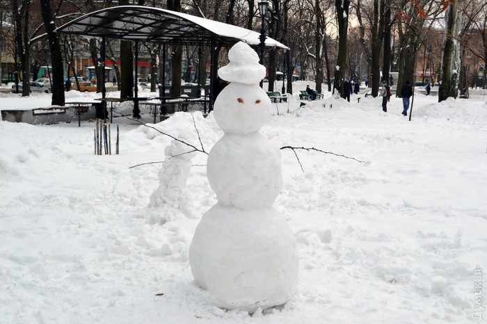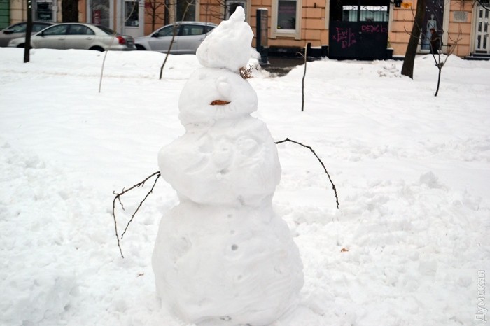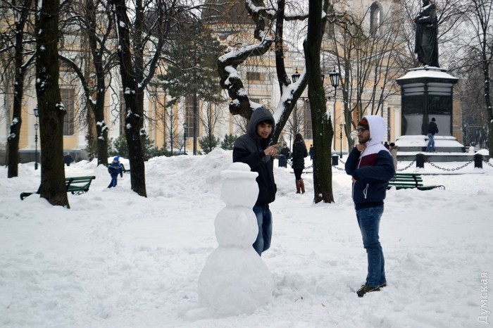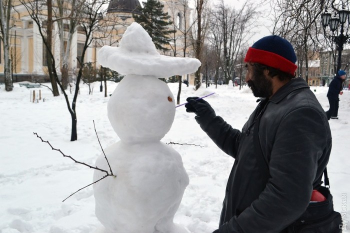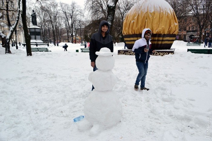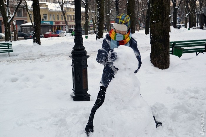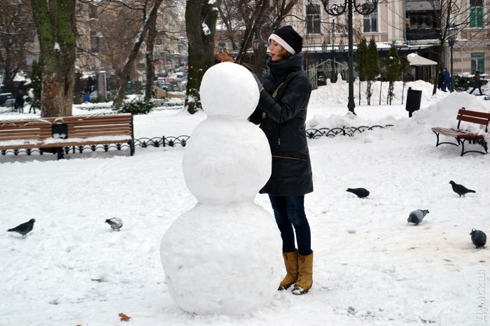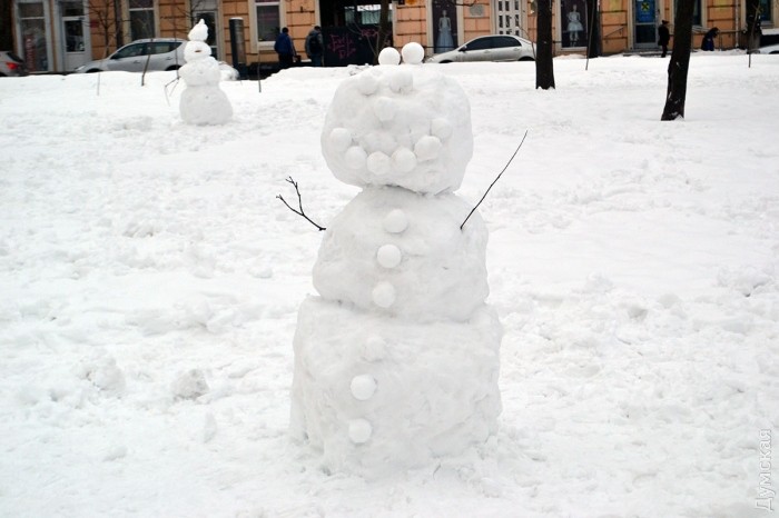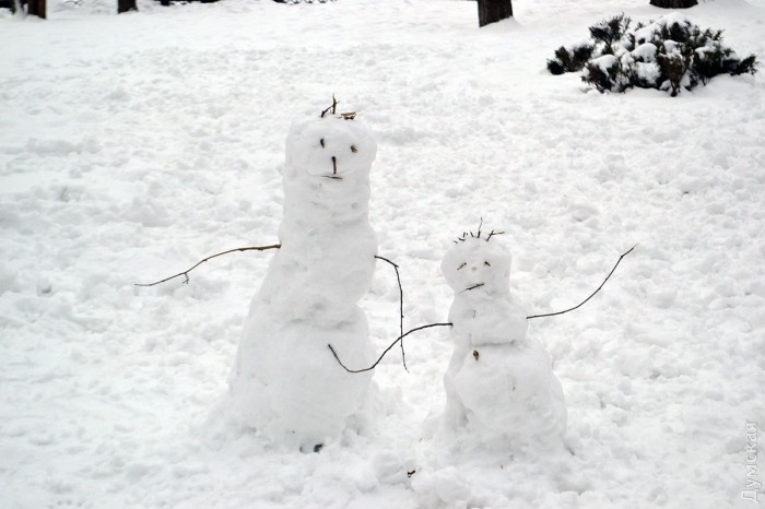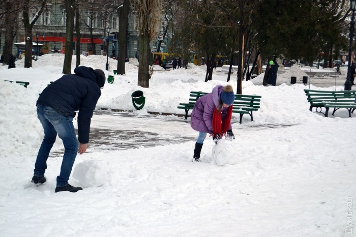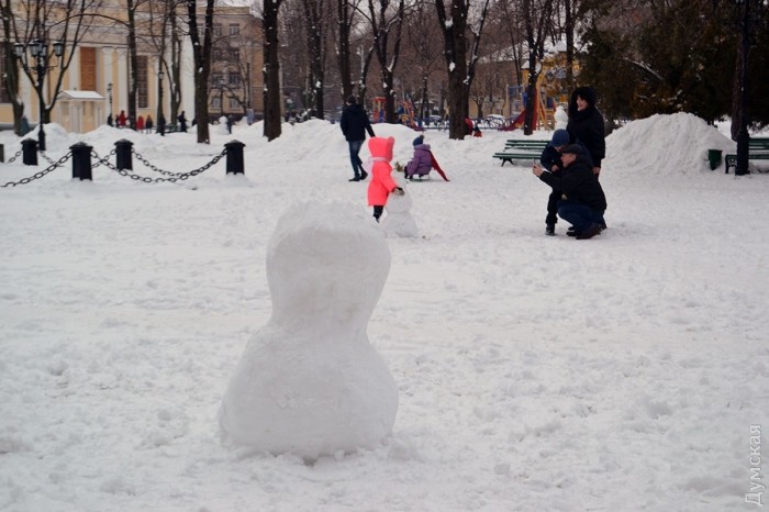 Снег в Одессе немного подтаял, став отличным материалом для лепки. Этим воспользовались горожане, которые отправились сегодня в парки и скверы лепить снежных баб.