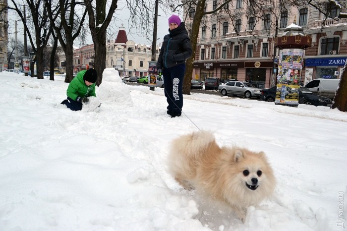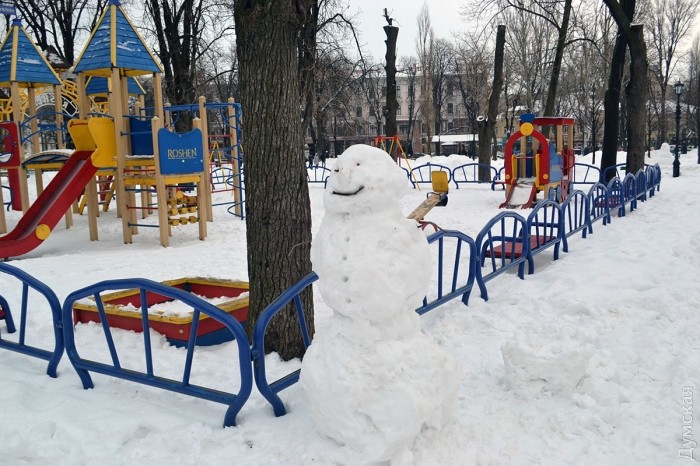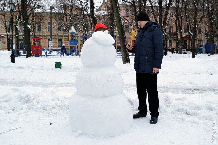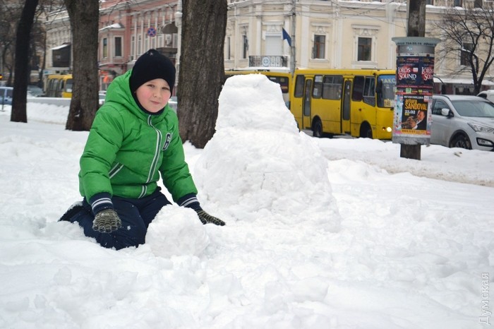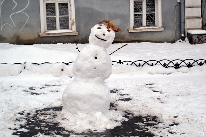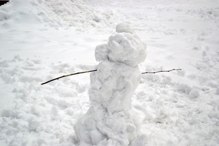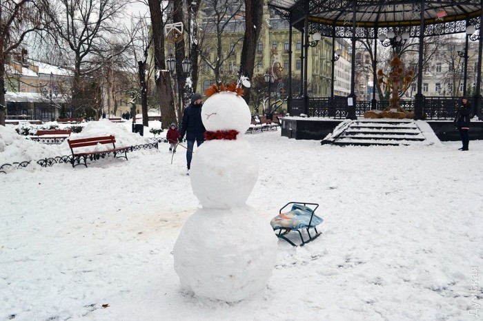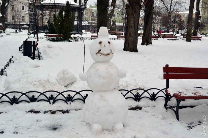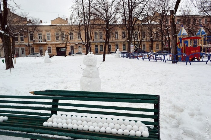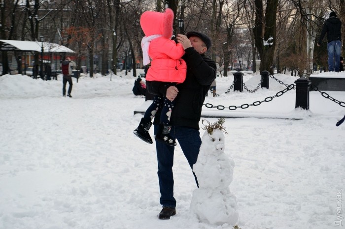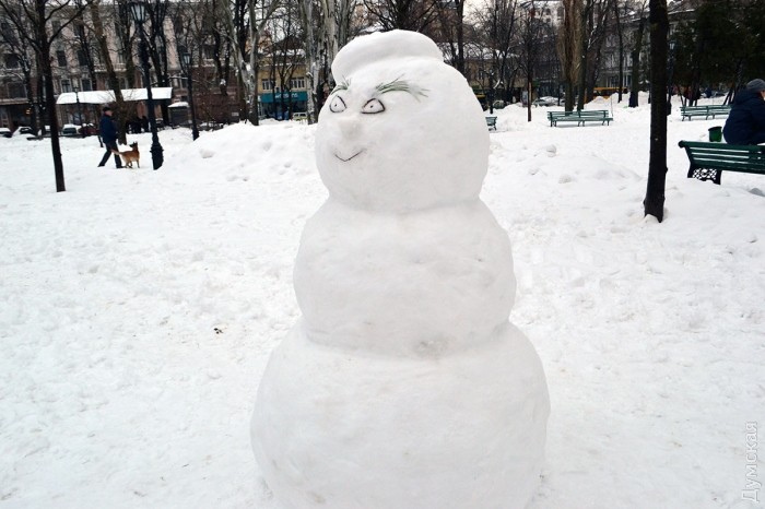 Снег в Одессе немного подтаял, став отличным материалом для лепки. Этим воспользовались горожане, которые отправились сегодня в парки и скверы лепить снежных баб.
