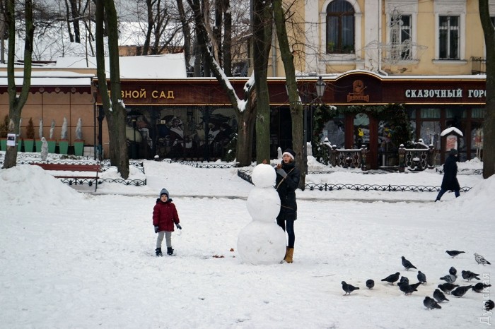 Самое большое скопление снеговиков «Думская» обнаружила на Соборной площади и в Горсаду. Их там десятки — большие и маленькие снеговики, несуразные и симпатичные. Кто-то даже создал снеговика по имени Моцарт, правда, у него женские черты.