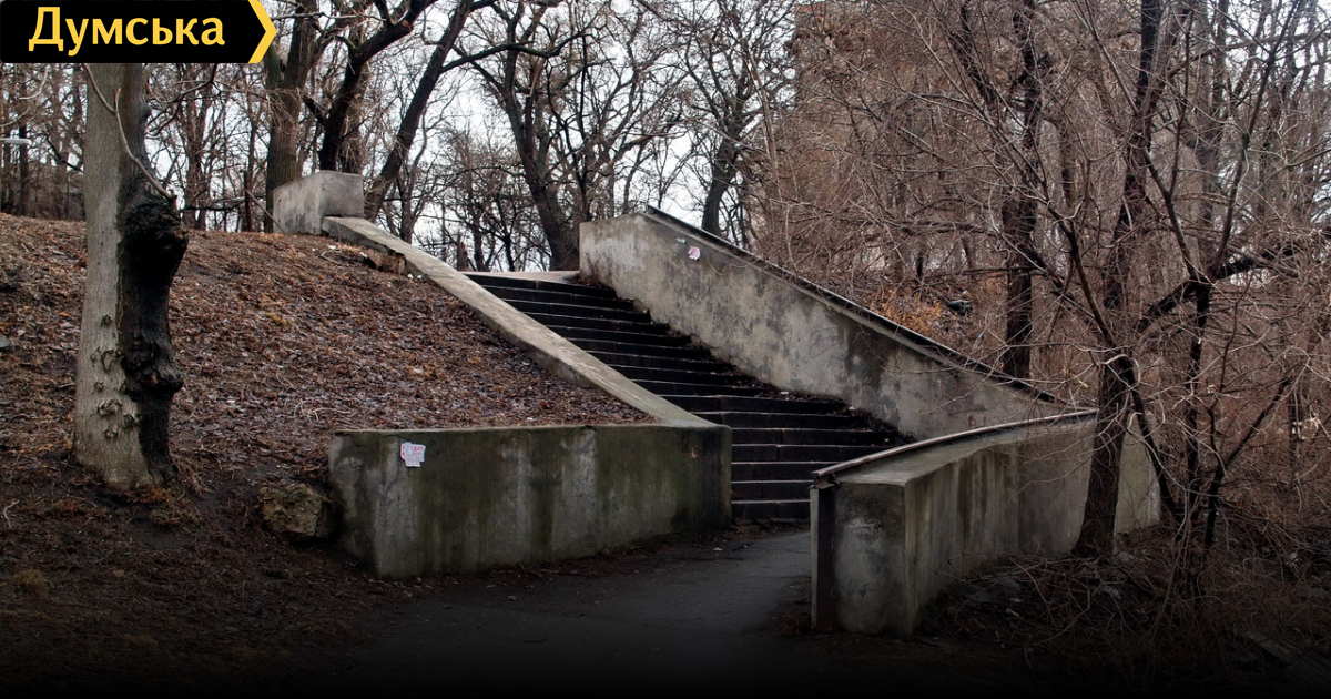 Рядом с трамвайной конечной «Херсонский сквер» есть неказистая с виду небольшая лестница из двух пролетов. С обеих сторон лестница ограждена невысоким бетонным парапетом. В один из парапетов вместо перила-поручня вмонтирован рельс.