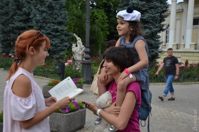 Суть акции «Одесса читает. Одессу читают» заключалась в том, что люди, выстроившись в цепочку, одновременно читают произведения Бабеля, Катаева, Ильфа и Петрова, Жаботинского и других писателей, рожденных или так или иначе связанных с Одессой.
