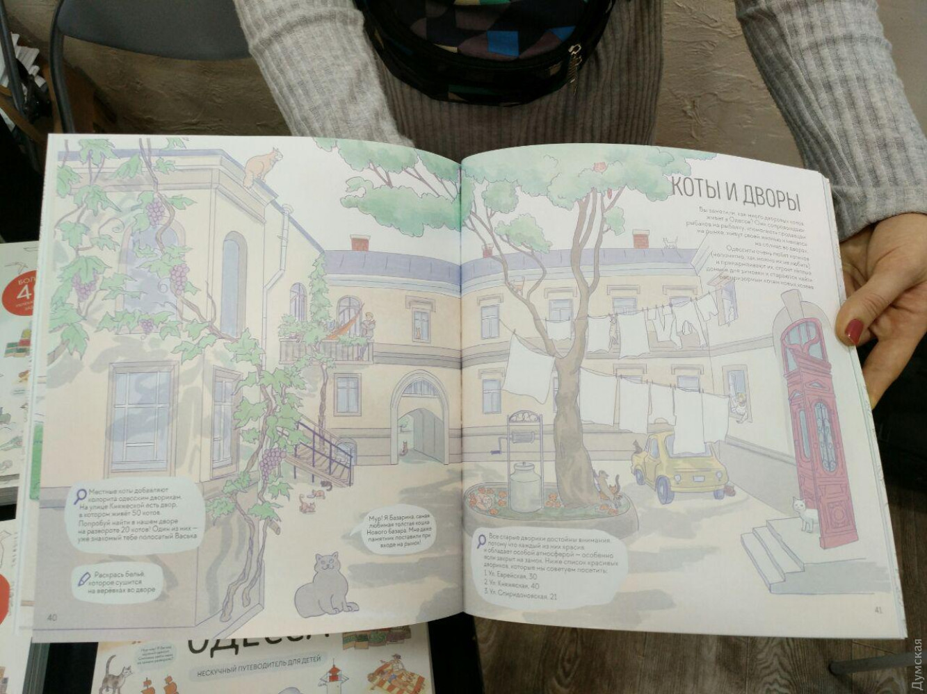 Во Всемирном клубе одесситов презентовали игровой путеводитель по Одессе. Книга ориентирована на малышей от 4 лет и создана специально для знакомства подрастающего поколения с главными достопримечательностями города. Создатель книги Галина Андреева рассказала, что ее давно терзал резонный вопрос – почему в туристическом Львове подобных изданий для детей насчитывается больше десяти, а в Одессе – ни одного. «У меня трое детей и они стали часто расспрашивать меня об истории Одессы, а я, к своему стыду, не могла дать быстрый и емкий ответ. И тогда мне, как дочке Одессы, захотелось узнать свой город получше. Была цель познакомить детей с городом, чтобы они полюбили его еще больше, чтобы улицы стали еще роднее, памятники более знакомыми», — рассказывает Галина Андреева. Галина стала искать соавторов и тех, кто помог бы ей реализовать задуманное. На помощь пришел ведущий телепроекта «Где идем», краевед Евгений Гриневич, а также иллюстраторы Татьяна Вовчик и Наталья Чернобрывец. Художники признались, что еще до начала работы над проектом часто делали зарисовки одесских зданий и двориков в полевых условиях, которые затем вошли в издание. В целом, по их словам, работа велась очень легко и теперь является их гордостью. В свою очередь, Евгений Гринкевич, на которого возложили всю ответственность за точность исторических фактов, рассказал, что самое сложное было отобрать наиболее интересные факты об Одессе. «Но результат превзошел все ожидания. Мой сын, после того как ее прочитал, начал сыпать вопросами и предложениями сходить и туда и сюда. Я считаю, это очень полезное начинание именно для одесских детей, потому что им не нужно никуда ехать, нужно просто выйти из дома», — говорит краевед. В путеводителе 64 страницы и он больше похож на толстый журнал с иллюстрациями. В рисованной форме здесь проложен маршрут по самым знаковым местам Одессы, отмечены городские достопримечательности и даны краткие, но емкие описания с использованием городских историй и легенд. На страницах путеводителя полно интерактива – здесь и кроссворды, и лабиринты, и всевозможные задания и упражнения, при выполнении которых можно узнать больше о родном городе. Картинки в издании специально выдержаны в пастельных тонах и так и просятся, чтобы их разрисовали. Кроме того, в самом конце можно найти специальные наклейки. «Таким образом каждый ребенок может стать своего рода соавтором книги», – рассказывает Галина. Создатель книги уверена, что путеводитель будет интересен не только детям, но и родителям. «Открыв книгу, можно и самому что-то узнать, и с ребенком поделиться, и наметить план куда пойти завтра. Потому что наш город очень богат и его нужно начинать любить с детства», — говорит Галина Андреева. Команда уже начала работать над созданием второй части путеводителя. В ней будут тематические компактные карты с маршрутами, которые будет удобно брать с собой на экскурсию. Приобрести путеводитель можно в книжных магазинах. Стоимость издания – 250 грн. Пока что путеводитель издан только на русском языке. В планах выпустить тираж на украинском. Фото Надежды Маркевич СМЕРТЬ РОСІЙСЬКИМ ОКУПАНТАМ! Помітили помилку? Виділяйте слова з помилкою та натискайте control-enter |