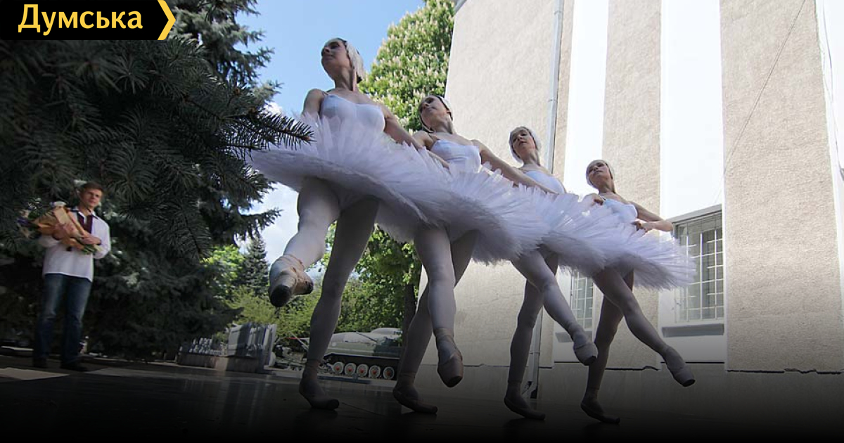 Отрывок из «Лебединого озера» исполнили одесские балерины у стен Военно-исторического музея на улице Пироговской в Одессе.