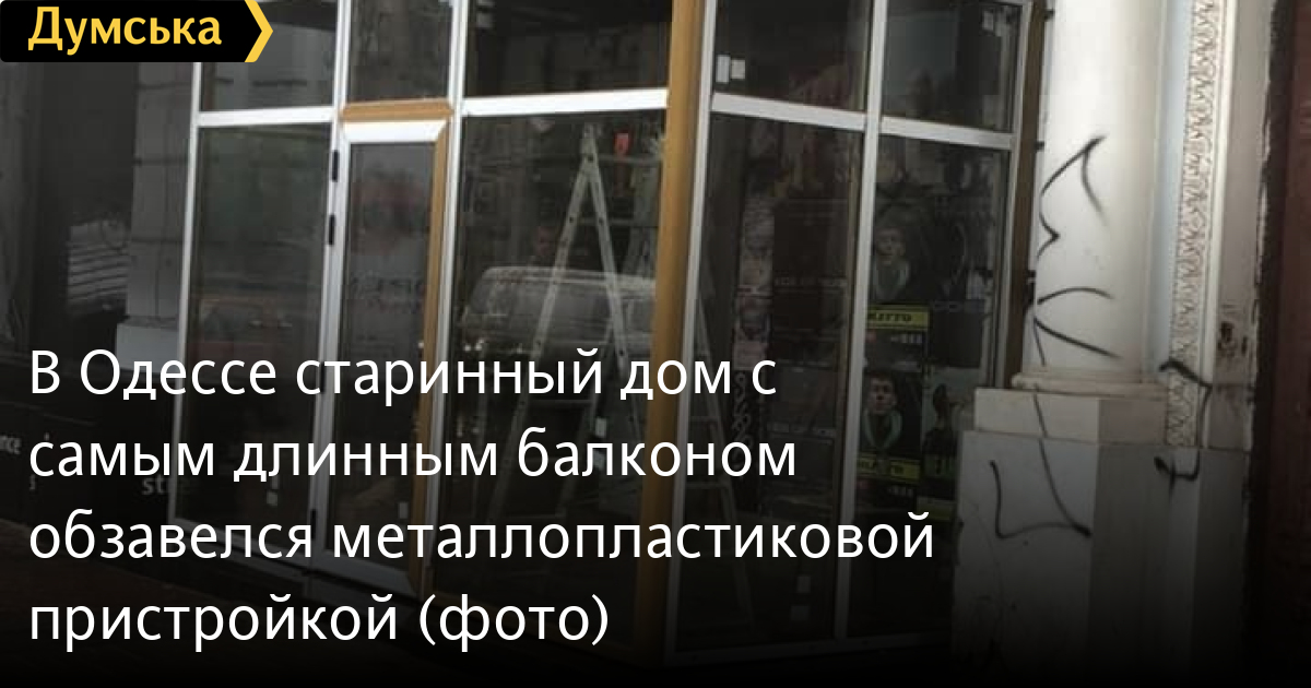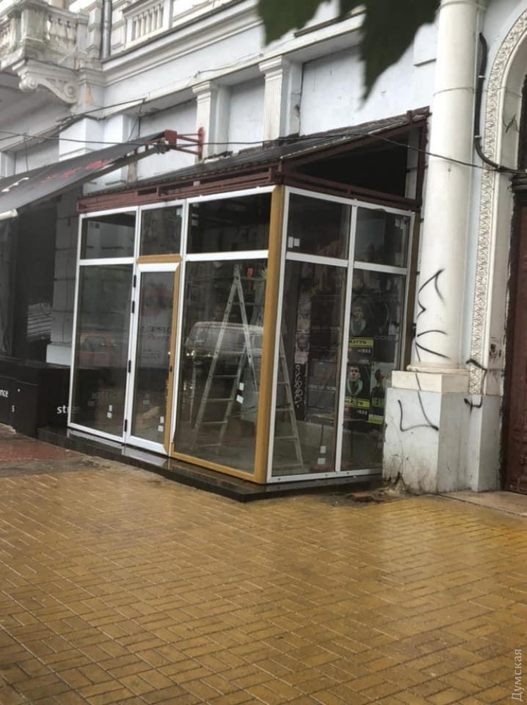 Металлопластиковую будку пристроили к фасаду памятника архитектуры по адресу Греческая, 25/ Екатерининская, 25, известного одесситам как «дом с самым длинным балконом».