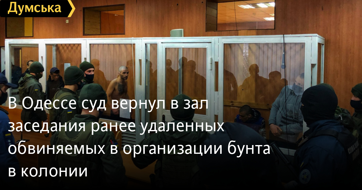 В Одессе суд вернул в зал заседания ранее удаленных обвиняемых в организации бунта в колонииКоллегия судей Малиновского райсуда приняла решение о возврате в судебный зал семерых фигурантов дела об организации бунта в одесской 51-й колонии. Об этом сообщили в пресс-службе суда. Напомним, с декабря 2020 года подсудимые не принимали участие в судебных заседаниях. Решение об их удалении из зала судьи приняли, ссылаясь на ст.330 УПК, после того, как фигуранты несколько раз вскрывали себе вены и устраивали беспорядки во время заседаний. Напомним, после разрушительного бунта в мае 2019 года, колония была расформирована. Недавно дважды безрезультатно попытались продать. СМЕРТЬ РОССИЙСКИМ ОККУПАНТАМ! Заметили ошибку? Выделяйте слова с ошибкой и нажимайте control-enter |
