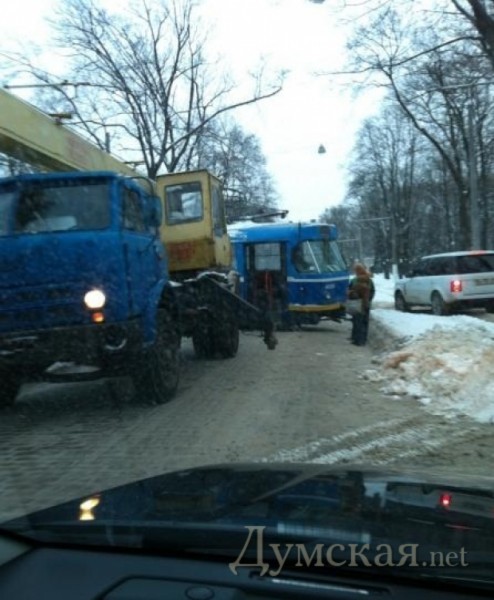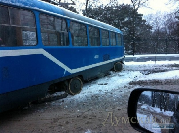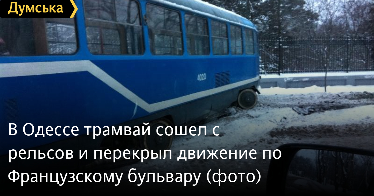 Вагон трамвая слетел с рельсов на одесском Французском бульваре, преградив дорогу для проезда автомобилей.