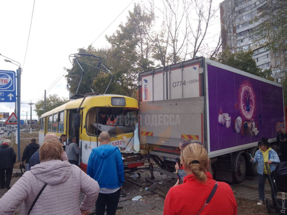 У КП «Одесміськелектротранс» повідомили «Думській», що ДТП сталася з вини водія вантажівки, який вискочив на рейки і не встиг проїхати перед трамваєм.