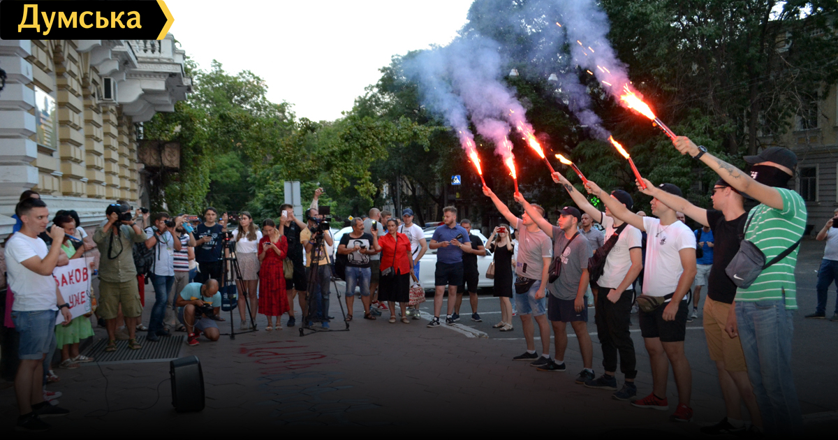 Акцию с требованием отправить в отставку министра внутренних дел Арсена Авакова прошла вчера у здания ГУНП в Одесской области. Как передает корреспондент «Думской», в ней приняли участие несколько десятков человек — члены различных общественных организаций. Активисты заявили, что возглавляющий МВД уже пять лет Аваков провалил реформу полиции, растерял профессиональные кадры и развел коррупцию, поэтому его дальнейшее пребывание на посту невозможно. Они краской написали у входа в ГУНП: «Аваков – черт», — зажгли файеры и несколько раз проскандировали эту фразу. Фото, видео — Андрей Колисниченко СМЕРТЬ РОСІЙСЬКИМ ОКУПАНТАМ! Помітили помилку? Виділяйте слова з помилкою та натискайте control-enter