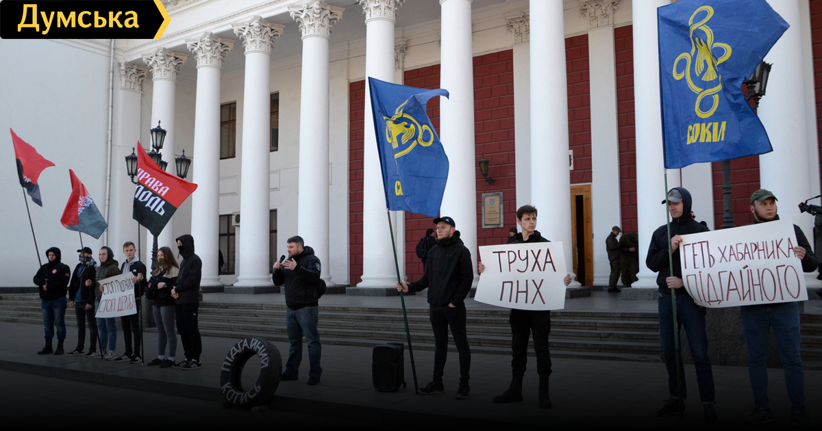 Политическая акция с требованием отправить в отставку назначенного недавно вице-мэра Одессы Сергея Подгайного прошла сегодня у здания муниципалитета. Как передает корреспондент «Думской», в ней приняли участие примерно два десятка членов организации «Сокол» и партии «Правый сектор». По словам представителя «Сокола» Игоря Харламова, Подгайный ранее уже занимал должность заместителя городского головы и отметился на ней выводом из городской собственности гостиницы «Большая Московская», что на Дерибасовской. «При пособничестве Подгайного Руслан Тарпан увел у города гостиницу, разрушил дом Руссова, а сейчас его снова назначили и, как мы считаем, не для спасения центра города, а для сбора средств под выборы, поэтому требуем отставки Подгайного», — сказал Харламов. Митинг, хоть и начался с большим опозданием, был непродолжительным. Собравшиеся проскандировали несколько речевок: «Труханов разрушает наш город», «Подгайного в отставку», «Подгайный катись геть», — после чего сделали групповое фото на фоне мэрии и разошлись. Перед этим радикалы заявили, что акция была предупредительной и в случае, если Труханов не выполнит их требования, они перейдет к более решительным действиям. Сергей Подгайный с 2005 по 2009 год, при Гурвице, был начальником управления дорожного хозяйства Одесского городского совета. В феврале 2009 года стал председателем Приморской райадминистрации Одессы. В 2011 году снова назначен на должность начальника управления дорожного хозяйства Одесского горсовета после победы на конкурсе. 29 февраля 2012 года мэр Алексей Костусев назначил Подгайного своим заместителем вместо уволенного Александра Орлова. Спустя четыре месяца Подгайный ушел в отставку и снова возглавил управление дорожного хозяйства. С 2014 по 2015 год был главой «Укравтодора». Фото, видео — Андрей Колисниченко СМЕРТЬ РОСІЙСЬКИМ ОКУПАНТАМ! Помітили помилку? Виділяйте слова з помилкою та натискайте control-enter
