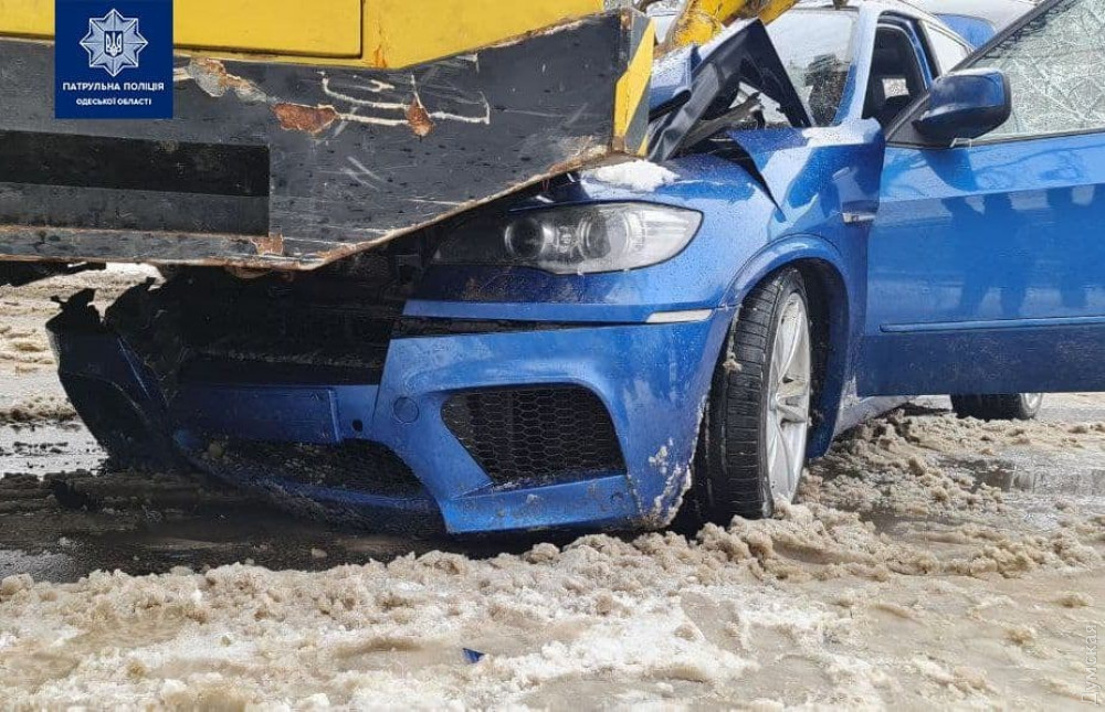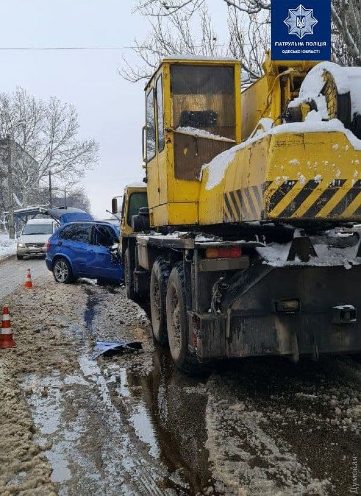 Автомобиль BMW X5 столкнулся с автокраном на Житомирской улице.