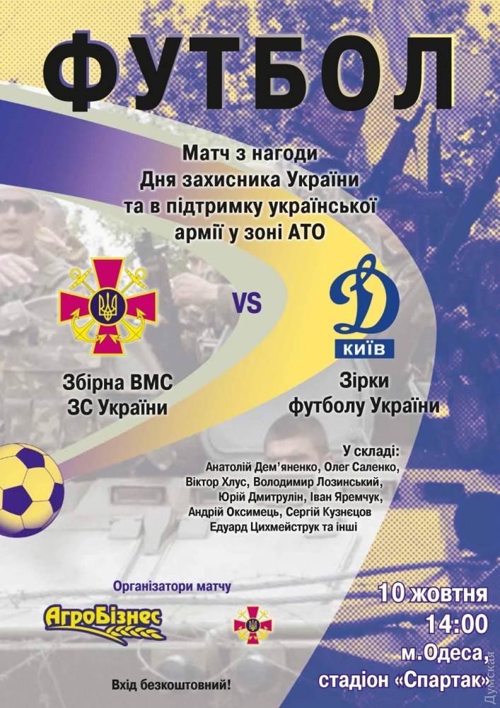 10 октября в Одессе пройдет футбольный матч между сборной ВМС и звездами отечественного футбола, сообщает пресс-центр Командования ВМС Украины. Поединок состоится на стадионе «Спартак». Соревнование приурочено ко Дню защитника Украины, который отныне отмечается 14 октября. На поле выйдут такие гранды украинского футбола, как Анатолий Демьяненко, Олег Саленко, Виктор Хлус, Владимир Лозинский, Юрий Дмитрулин, Иван Яремчук и другие. Начало матча — 10 октября в 14:00. Вход свободный. СМЕРТЬ РОСІЙСЬКИМ ОКУПАНТАМ! Помітили помилку? Виділяйте слова з помилкою та натискайте control-enter |