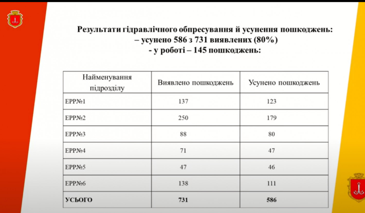 Были проведены гидравлические испытания, после которых обнаружили 731 повреждение труб. 586 их них, или 80%, уже устранили.