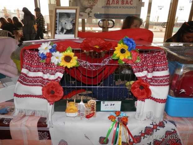 Участие в выставке приняли почти три десятка питомцев. Их хозяева старались как можно ярче и креативнее украсить клетки, так как в рамках конкурса была номинация и на самое необычное жилище. Примечательно, что основной тематикой для оформления крысиных домиков стала национальная символика – клетки украшали сине-желтыми ленточками и даже рушниками.