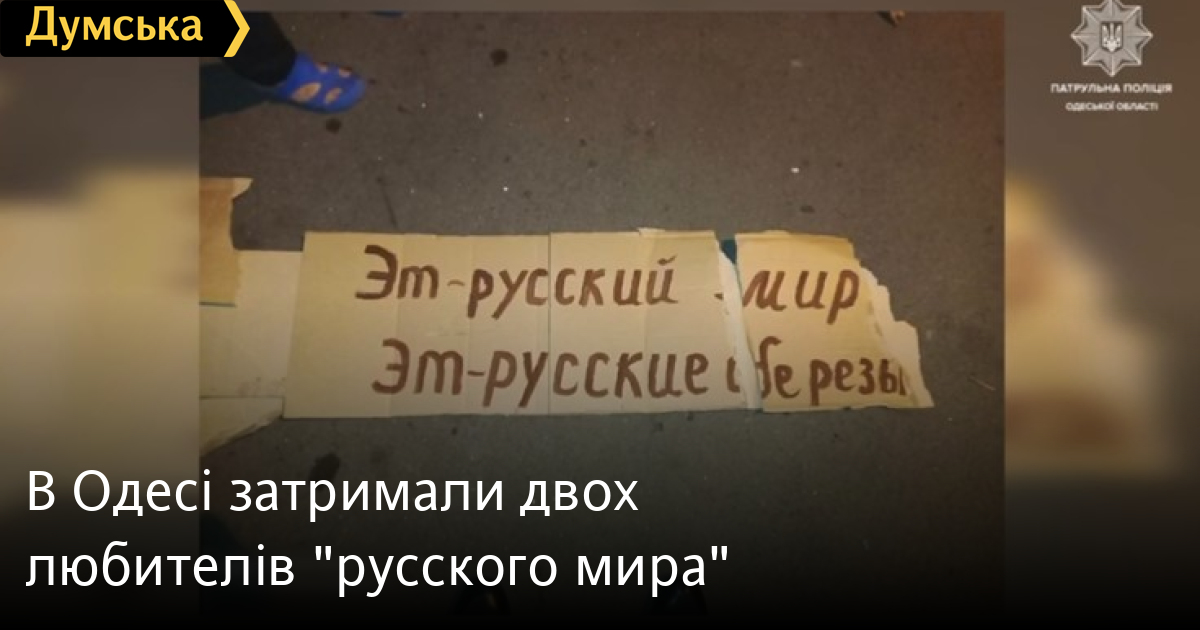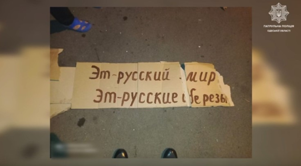 Як повідомили у пресслужбі патрульної поліції, скориставшись сходами, молотком та цвяхами вони прикріпили плакат із агітацією за «русский мир».