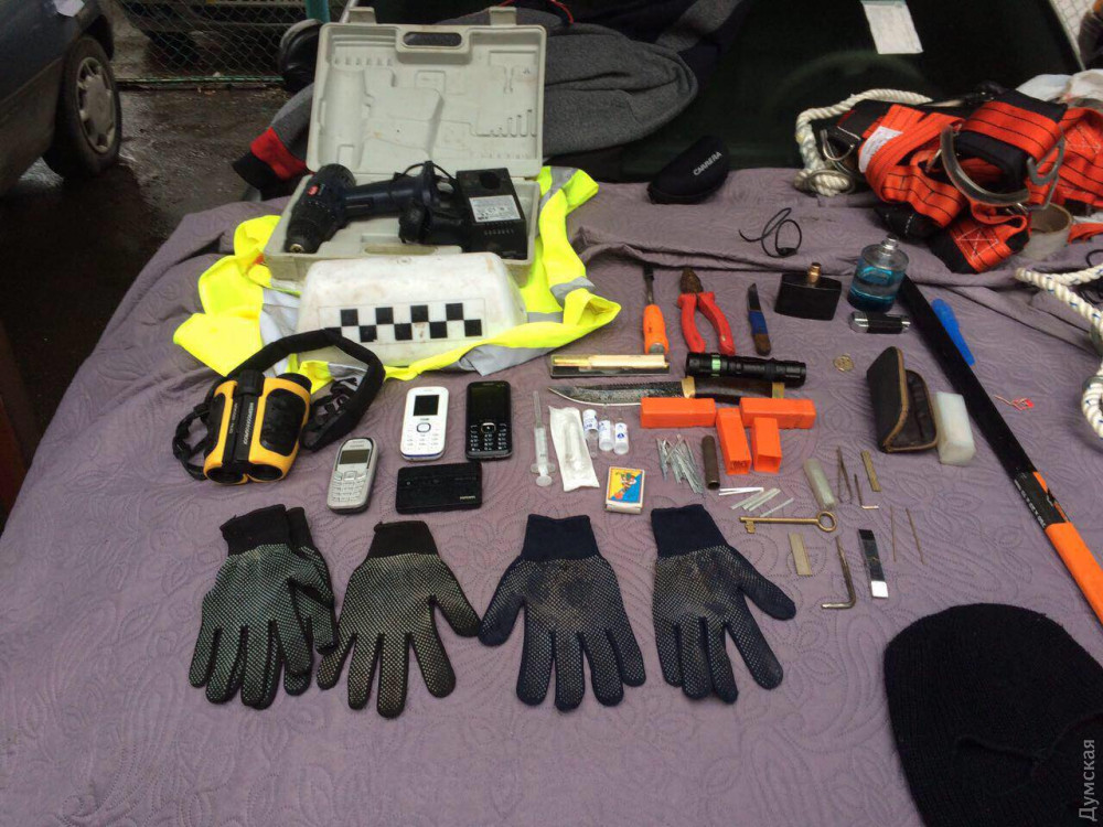 В ходе обыска автомобиля задержанных обнаружили воровскую «амуницию»: нож, отмычки, снаряжение альпиниста, балаклавы, перчатки и прочее.