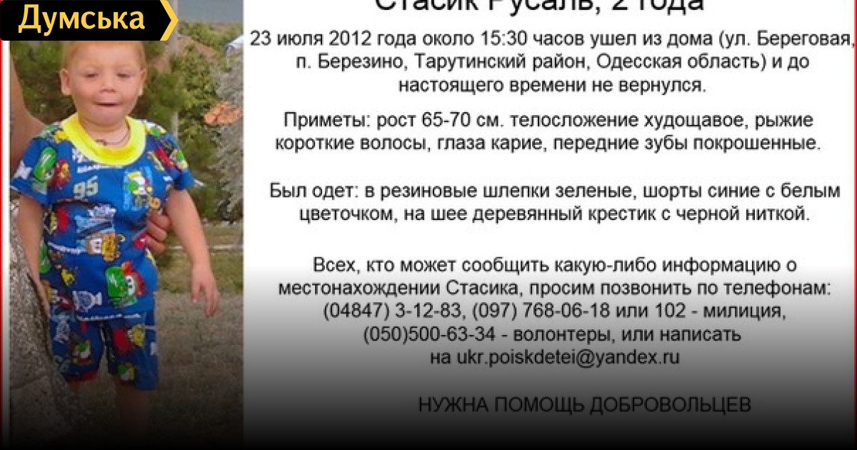 В Одесской области с 23 июля ищут 2-летнего Стасика Русаля, проживавшего в пос. Березино, Тарутинского района. Ребенок ушел из дома около 15.30. Мама заявила о пропаже сына через сутки. Правоохранители обращаются к помощи добровольцев. СМЕРТЬ РОСІЙСЬКИМ ОКУПАНТАМ! Помітили помилку? Виділяйте слова з помилкою та натискайте control-enter |