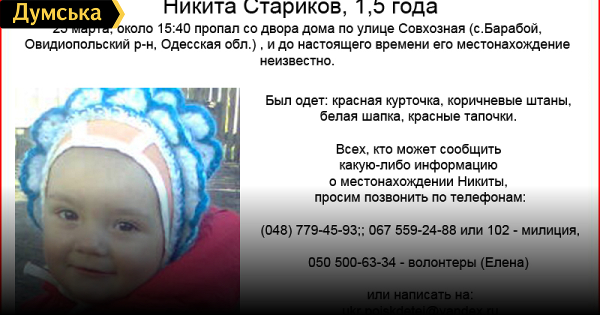 В настоящее время участники операции прочесывают окрестные поля, пойму реки Барабой, балку, осматривают заброшенные строения. Затрудняют поиск сложные погодные условия – снег и минусовая температура. По словам председателя Барабойского сельсовета Виталия Кушко, милиция оперативно проверила версию о похищении ребенка, но подтвердить ее не смогла. «Действительно, вчера в селе проезжали белые «Жигули» скупщиков металлолома. Их нашли, но ребенка не обнаружили», — сказал он. Кушко добавил, что Никита растет в неблагополучной семье: «Родители практически за ним не смотрели». Напомним, как ранее сообщил нам начальник пресс-центра облУВД Владимир Шаблиенко, за полтора часа до исчезновения малыша увидела гуляющим возле дороги соседка и привела домой. Но потом он снова пропал. Для того, чтобы иметь возможность привлечь к поискам максимально возможное количество ресурсов, милиция открыла по факту исчезновения ребенка уголовное производство по ч.2 ст. 115 УК Украины («умышленное убийство»). Всех, кому что-либо известно о местонахождении Старикова Никиты Спартаковича 2011-го года рождения, просят позвонить по телефонам (048) 7790-45-93, (067) 559-24-88 или обратиться в ближайшее отделение милиции.