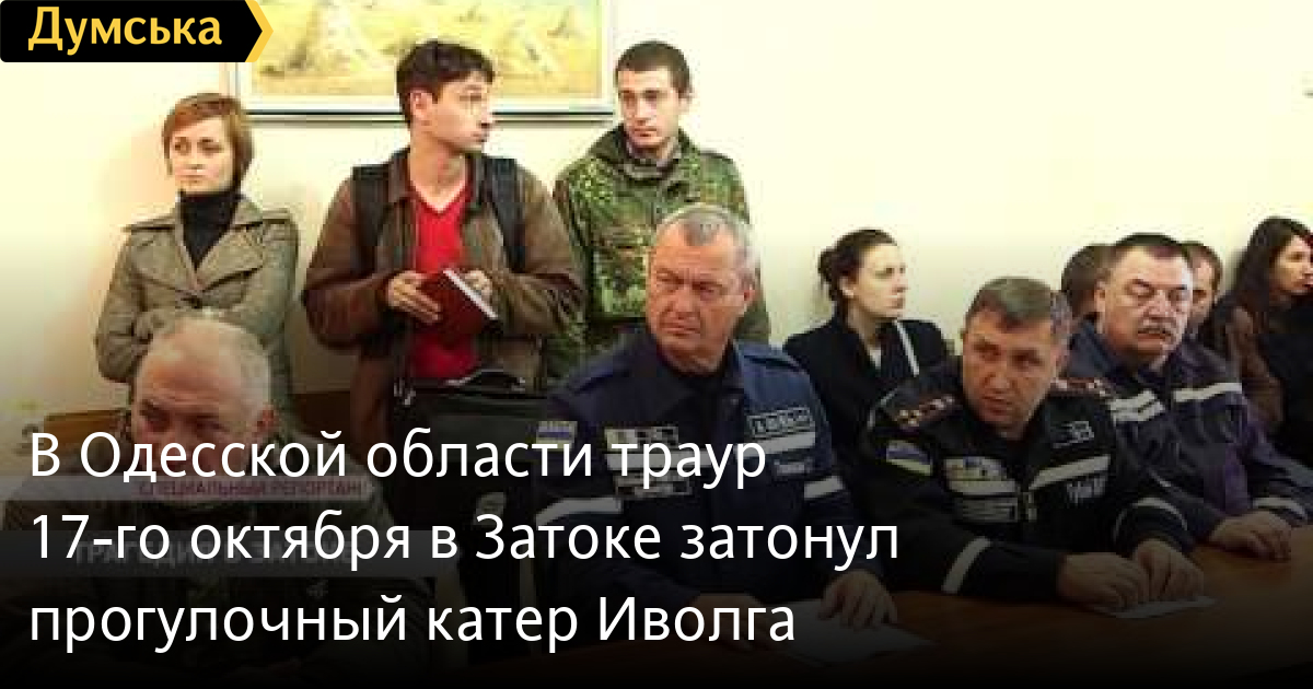 В Одесской области траур – 17-го октября в Затоке затонул прогулочный катер «Иволга». Погибло 12-ть человек, 20-ть – госпитализировали, еще двое числятся без вести пропавшими. «Иволга» вышла ранним утром на ловлю бычков, а около половины четвертого вечера перевернулась от мощного удара волны. Сигнал бедствия экипаж не пОдал. Крушение заметили моряки проплывающего мимо судна и пришли на помощь.