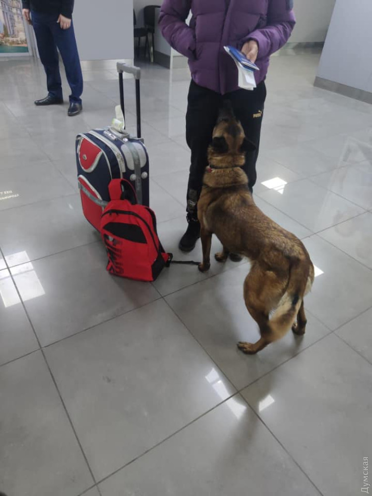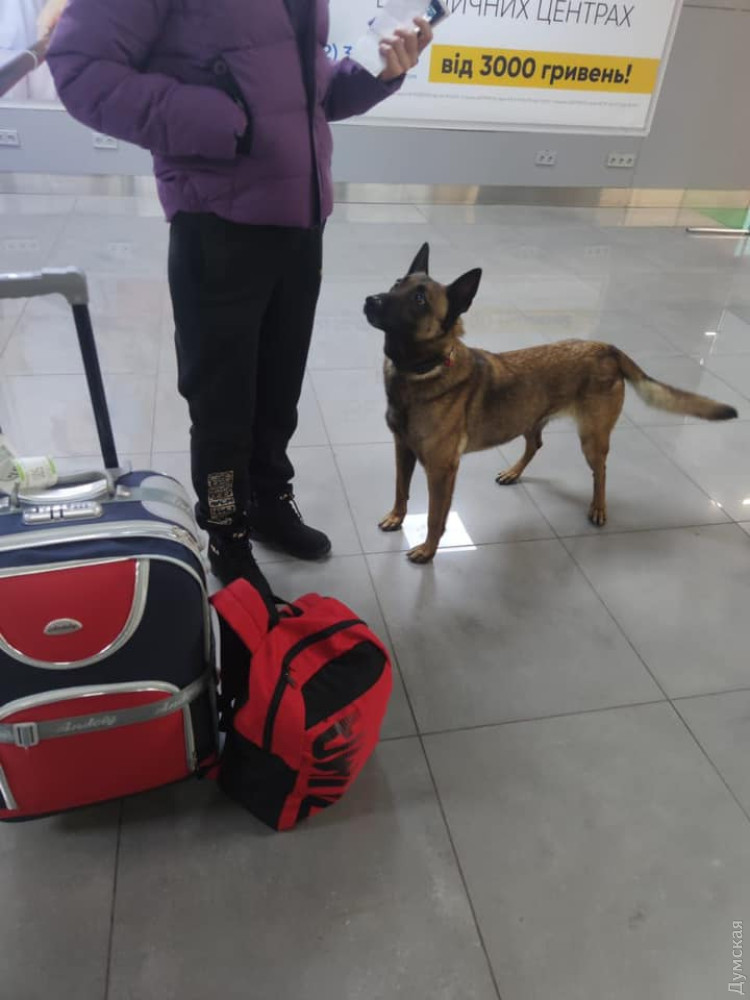 Служебная собака таможенников Фифа обнаружила сверток с коноплей в кармане у пассажирки, которая вчера прилетела в Одессу из Испании.