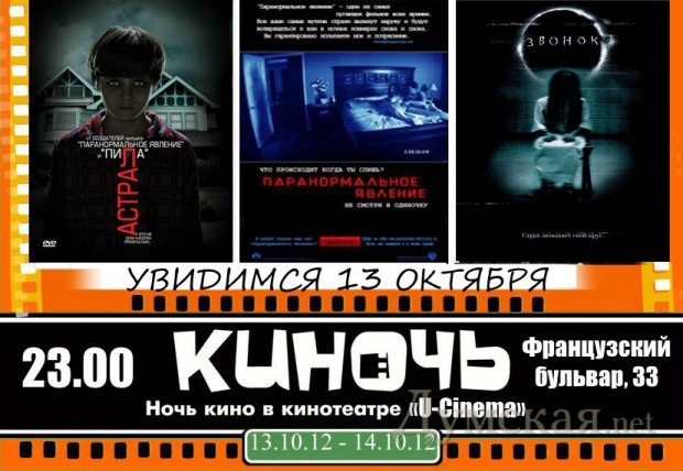 Мероприятие проводится пабликом «Одесса как она есть». Как сообщают организаторы, зрители увидят «Астрал», «Паранормальное явление» и «Звонок». Цена билета составляет 60 гривен. Начало киноночи – 13 октября в 23:00.